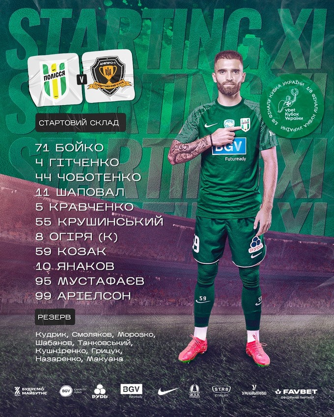 «Полісся»: Бойко, Гітченко, Чоботенко, Шаповал, Кравченко, Крушинський (Кушніренко, 46), Огіря (Танковський, 46), Козак, Янаков (Макуана, 46), Мустафаєв (Грицук, 74), Аріелсон (Назаренко, 84).