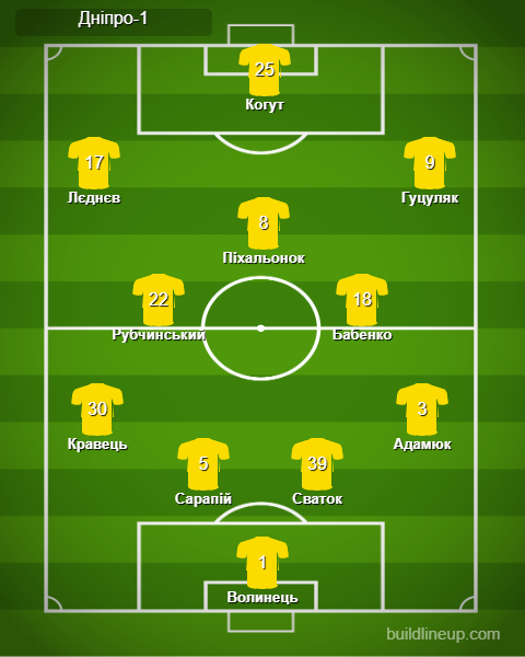 «Дніпро-1»: Волинець, Кравець (Мірошніченко, 95), Сарапій, Сваток, Адамюк (Пуріта, 79), Рубчинський, Бабенко, Лєднєв (Пірес, 72), Піхальонок, Гуцуляк, Когут (Ківінда, 72, Танчик, 106).