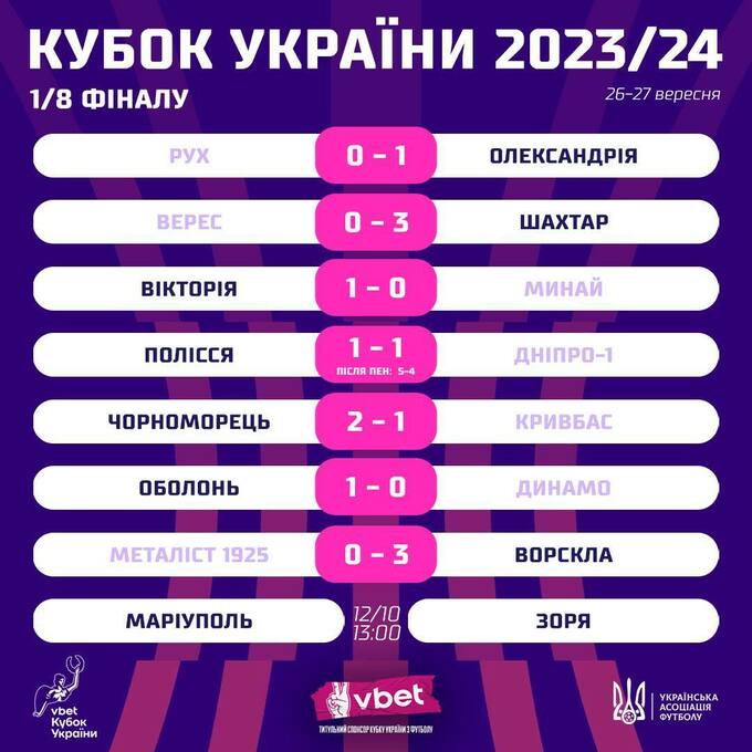 26 та 27 вересня відбулися матчі 1/8 фіналу Кубка України 2023/24.