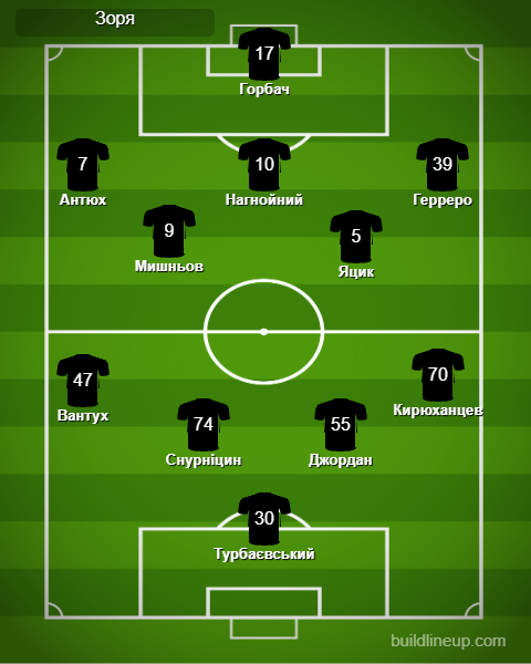 «Зоря»: Турбаєвський - Кирюханцев, Снурніцин, Джордан, Вантух - Мишньов (Головкін, 86), Яцик - Герреро, Нагнойний (Волошин, 80), Антюх (Данченко, 86) - Горбач (Венделл, 80).