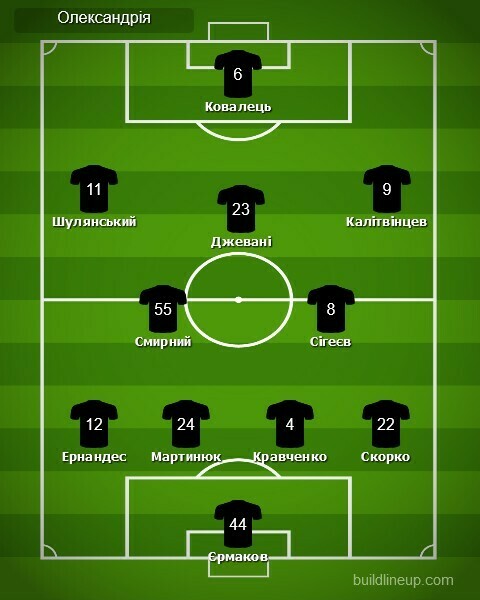 «Олександрія»: Єрмаков, Ернандес (Шостак, 23), Мартинюк, Кравченко, Скорко (Гарькавенко, 76), Смирний, Сігеєв, Шулянський (Микитишин, 62), Джевані (Безерра, 62), Калітвінцев, Ковалець (Андрейчук, 76)