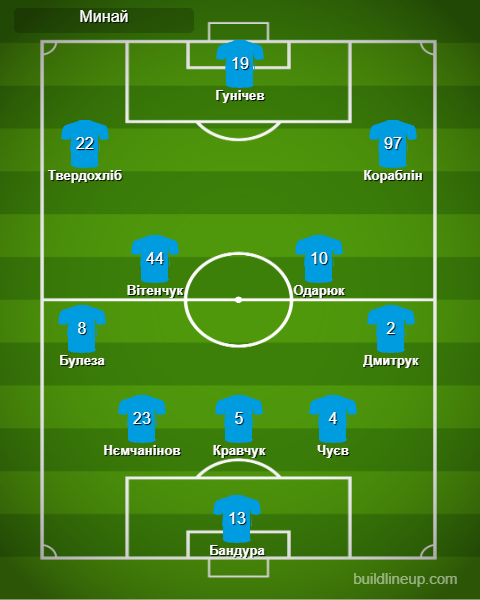 «Минай»: Бандура, Нємчанінов, Дмитрук (Гечев, 80), Кравчук, Булаза, Вітенчук, Чуєв (Солдат, 73), Одарюк (Голуб, 57), Кораблін, Гунічев (Рогозинський, 73), Твердохліб.