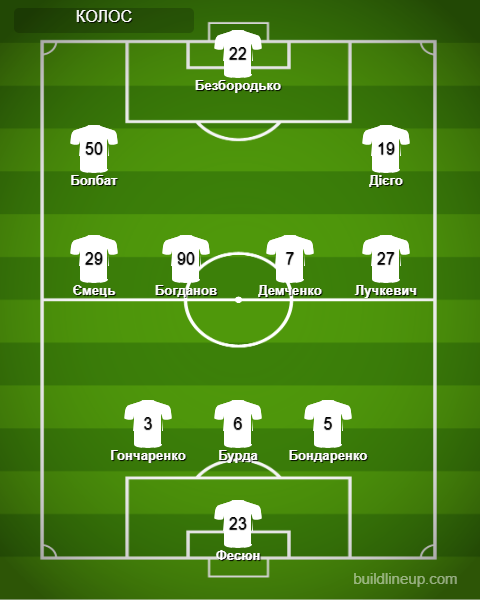 «Колос»: Фесюн - Лучкевич, Бурда, Бондаренко, Чорноморець, Ємець - Богданов (Мілько, 82), Демченко - Болбат (Ільїн, 75), Дієго (Велетень, 61) - Безбородько (Попов, 82).