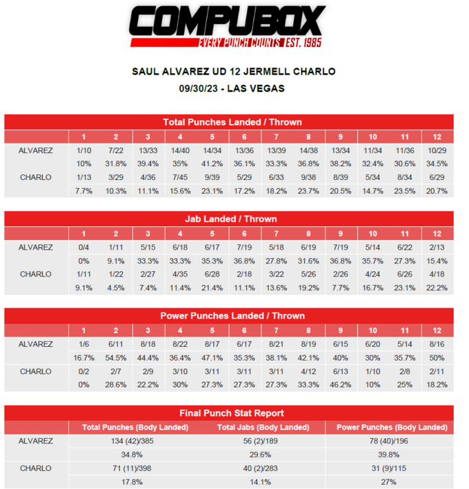 Альварес був активнішим практично у всіх раундах, завдавав удвічі більше точних ударів (134 проти 71), особливо силових (78 проти 31). Чарло більше працював джебом (283 проти 189), але з точністю були проблеми.