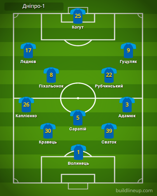 «Дніпро-1»: Волинець – Каплієнко (Є. Пасіч, 73), Кравець (Горін, 78), Сарапій, Сваток, Адамюк – Лєднєв (Горбунов, 72), Рубчинський, Піхальонок, Гуцуляк – Когут (Пуріта, 28).