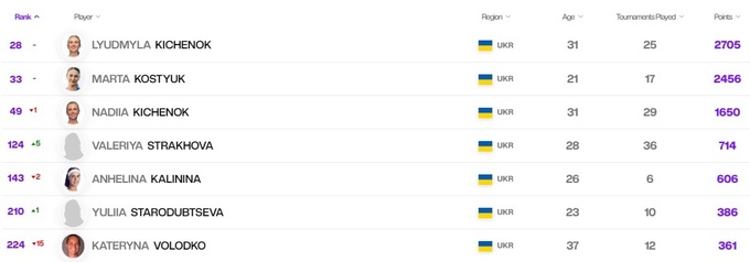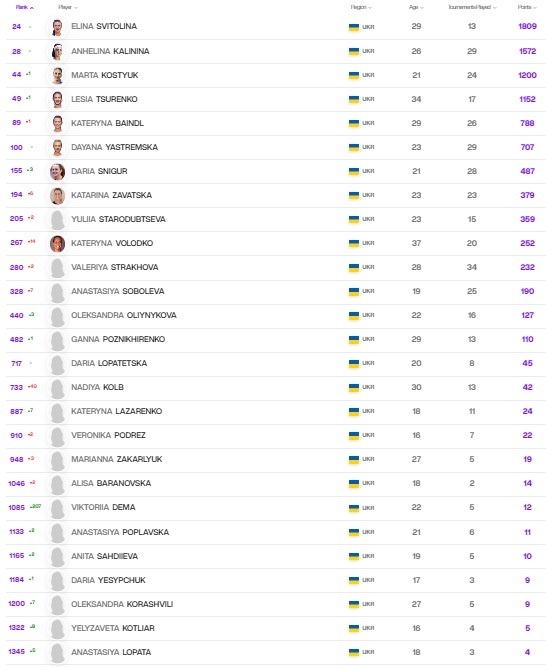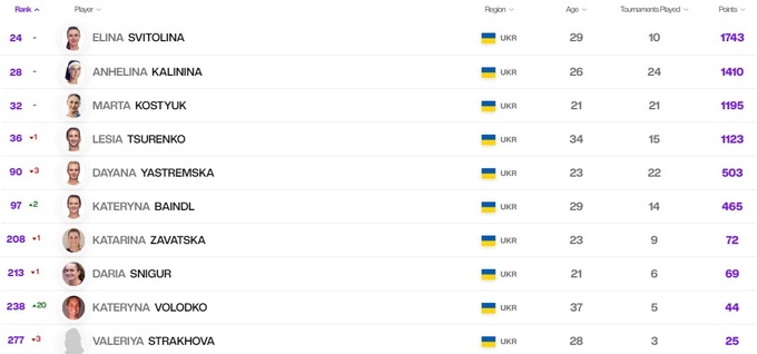 Що стосується українок, то Марта Костюк і Леся Цуренко піднялися на одну сходинку, Ангеліна Калініна, Еліна Світоліна та Даяна Ястремська залишилися на своїх місцях. Трохи покращилося становище Дарини Снігур, а Катаріна Завацька, Юлія Стародубцева та Катерина Володько трохи опустилися в списку.