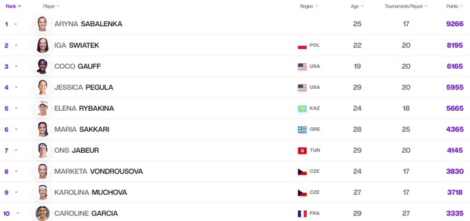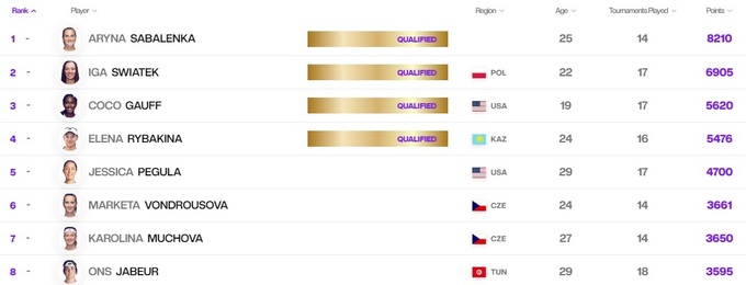 У Чемпіонській гонці Джессіка Пегула вже забезпечила собі участь у Підсумковому турнірі WTA, хоча на сайті це ще не показано. За решту місць триває боротьба, але Марія Саккарі, яка йде на 9-й позиції, відстає на 465 очок.