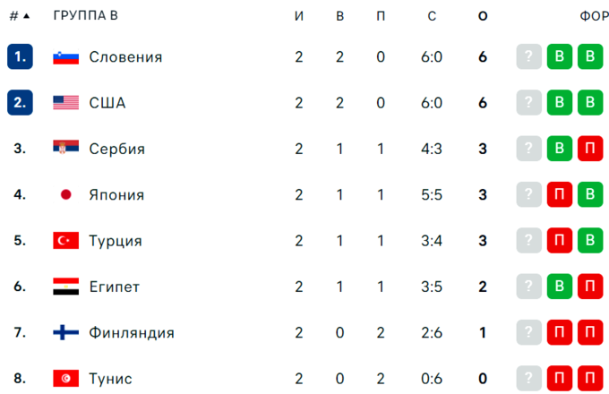 У групі В (команди грають у японській столиці Токіо) також дві збірні набрали по 6 очок. Це Словенія та США. Вони, до речі, ще не програли жодній партії. По одній перемозі та по одній поразці у Сербії, Японії, Туреччини та Єгипту. Привертають увагу результати господарів турніру. Японські волейболісти, яких до старту відбіркових матчів називали серед фаворитів, поки явно недобирають очок. У стартовій грі вони насилу здолали Фінляндію 3:2, а в другому турі програли Єгипту 2:3. А далі вже у них підуть поєдинки з найголовнішими суперниками.