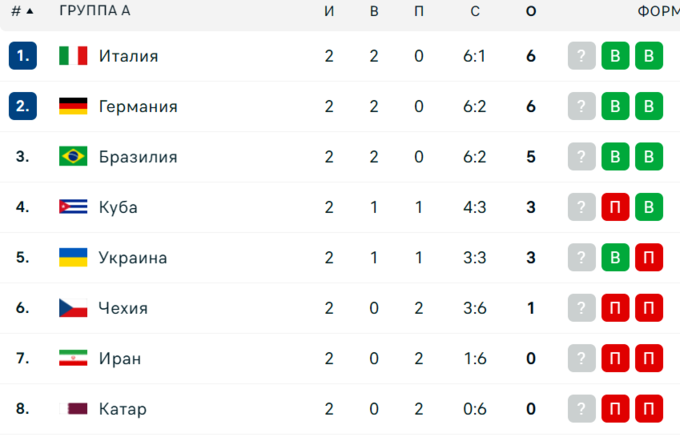 Загалом у групі А, де виступають ці дві команди, максимальну кількість очок набрали збірні Італії та Німеччини. Вони здобули по дві перемоги. Стільки ж вікторій і в Бразилії, але в другому турі одні з головних фаворитів групи несподівано насилу в п'яти партіях здолали Чехію. Причому результат тай-брейку 16:14. Програли у своєму другому матчі кубинські волейболісти, які дуже чудово виглядали в поєдинку з Україною. А от Німеччина, схоже, серйозно націлилася на одну з путівок до Парижу. Але головні матчі для німецької команди ще попереду і найближчий із них вже у 3-му турі з Бразилією.