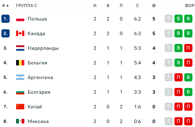 А ось у групі С (тут матчі проходять у китайському місті Сіань), жодній із команд не вдалося уникнути втрат. Нещодавні чемпіони Європи польські волейболісти у стартовій грі лише у п'ятому сеті зломили опір Бельгії, натомість у другому матчі обіграли Болгарію 3:0. Також 5 очок в активі волейболістів Канади, які перемогли Нідерланди 3:2 та Аргентину 3:1. Щодо господарі майданчика, то збірна Китаю явно провалила старт цього турніру, по черзі програвши Болгарії 0:3 і Бельгії 1:3.
