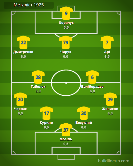 «Металіст 1925»: Мозіль – Червак, Курило, Безуглий, Жичиков – Габелок, Вачіберадзе – Дмитренко (Юсов, 65), Чирук (Сидоров, 65), Арі – Борячук.