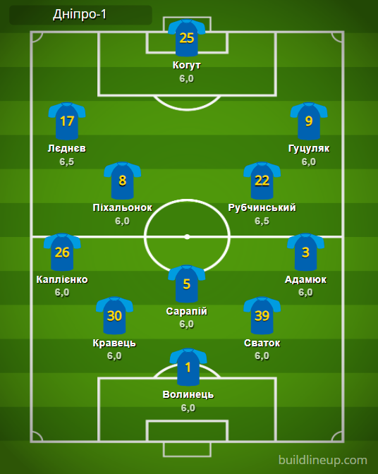 «Дніпро-1» (заміни): Пуріта – 6,5, Горбунов – 6,0, Є. Пасіч – 6,0, Горін – б/о.