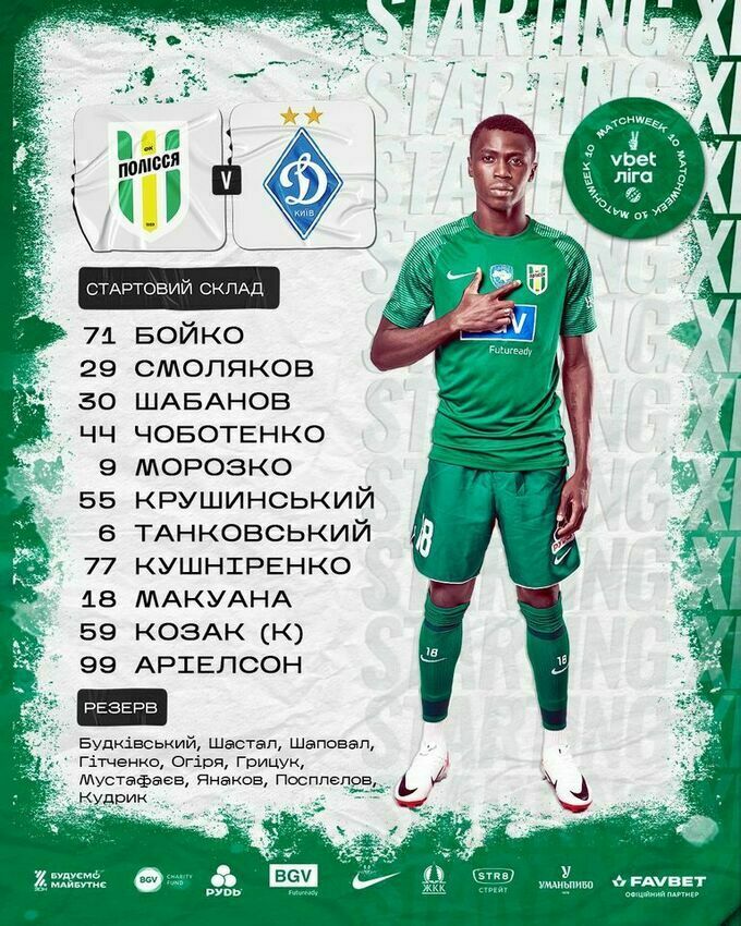 «Полісся»: Бойко, Смоляков, Шабанов, Чоботенко, Морозко, Танковський (Огіря, 84), Крушинський (Гітченко, 71), Кушніренко, Козак, Аріелсон (Будківський, 61), Макуана.