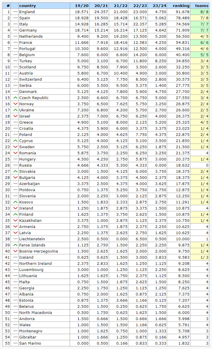 Країни, які наприкінці сезону 2023/24 опиняться поза топ-15 за підсумками 5-річного рейтингу, залишаться з чотирма командами в єврокубках і лише з одним представником у кваліфікації Ліги чемпіонів.