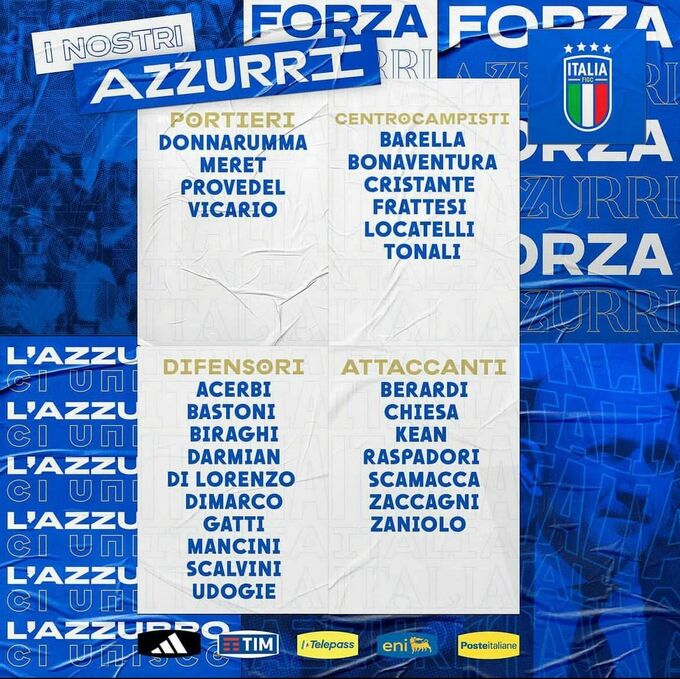 Зазначимо, що Дестіні Удогі викликаний до дорослої збірної Італії вперше, Джакомо Бонавентура не викликався три роки. У заявці відсутній форвард «Лаціо» Чіро Іммобіле.