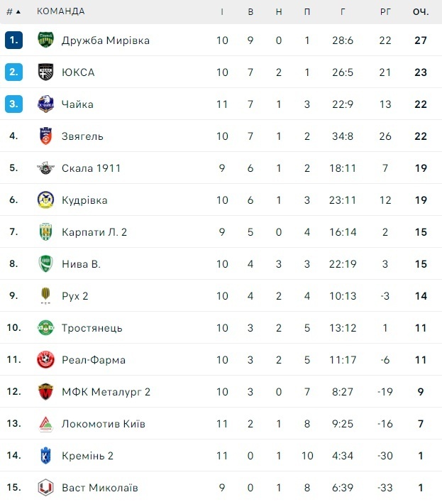 На другій позиції йде команда ЮКСА з 23 очками, але матч туру проти «Скали 1911» вона проведе в суботу, 7 жовтня.