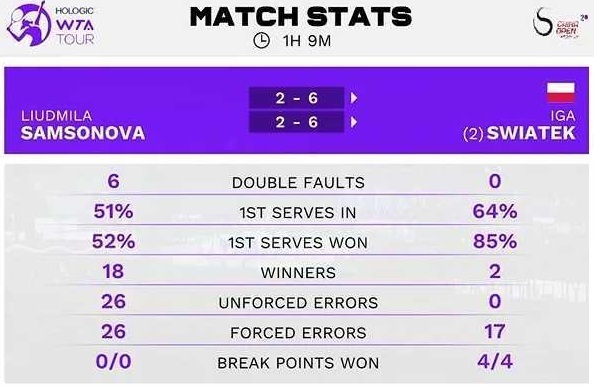 Друга ракетка світу Іга Свьонтек у двох партіях обіграла Людмилу Самсонову (№22 WTA).