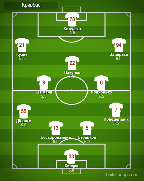 «Кривбас»: Кліщук, Понєдєльнік, Бескоровайний, Стецьков, Нябейє, Кузик (По, 60), Приходько, Бізімана, Вакулко (Татарков, 7, Семотюк, 85), Задерака, Кожушко.