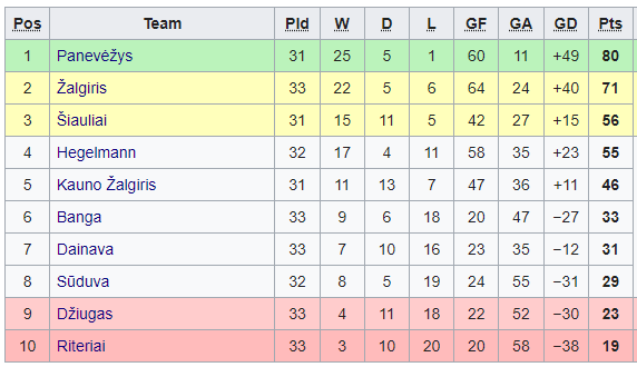 У Литві національний турнір відбувається за системою весна-осінь. Перевага «Паневежиса» над «Жальгірісом» складає 9 очок, причому переслідувачу з Вільнюса залишилося провести три гри.