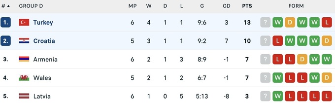 У матчі лідерів групи D збірна Хорватії на своєму полі приймала національну команду Туреччини. Гості зуміли здобути мінімальну перемогу у матчі завдяки єдиному голу на 30-й хвилині у виконанні Бариша Їлмаза. Турецька збірна взяла реванш у хорватів за минулорічну домашню поразку та очолила групу D.