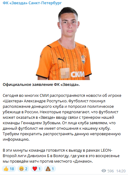 Клуб «Звєзда» санкт-петербург опублікував офіційну заяву щодо ситуації з вихованцем «Шахтаря» Олександром Роспутьком, який не повернувся разом із донецькою командою U-19 після матчу Юнацької ліги УЄФА в Антверпені: