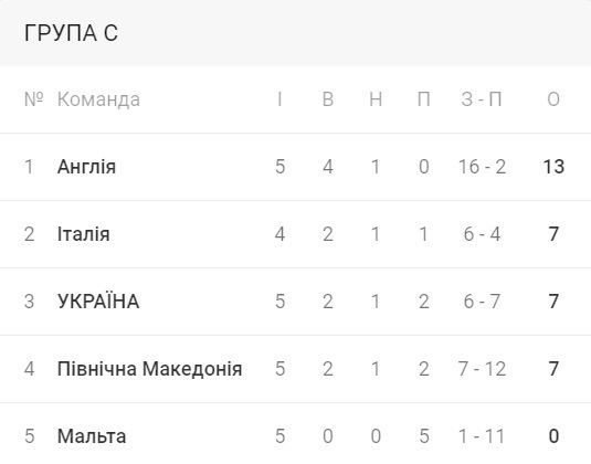 Після 5 із 8 зіграних матчів збірна України має 7 очок. Стільки ж у Італії та Північної Македонії. Але італійці зіграли на один матч менше, хоча попереду в них ще гра в Англії. У нас після гри з македонцями зустріч із Мальтою та очне протистояння зі Скуадрою 20 листопада в номінально домашньому Леверкузені.