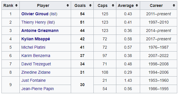 До топ-3 бомбардирів входять: Олів'є Жиру, Тьєррі Анрі, Антуан Грізманн