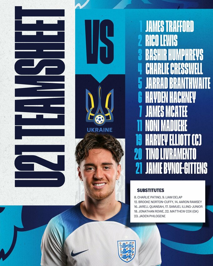 Англія U-21: Треффорд, Брентуейт, Гамфріз (Ілінг-Джуніор, 58), Кресуелл, Лівраменто (Нортон-Каффі, 73), Байно-Гіттенс (Філоджін, 58), МакЕйті (Роу, 73), Гекні (Ділеп, 58), Льюїс, Мадуеке, Елліотт.
