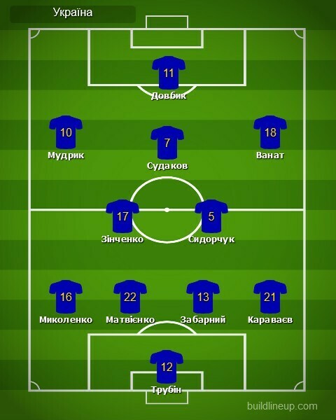 Україна: Трубін, Миколенко, Матвієнко (Сваток, 46), Забарний, Караваєв (Зубков, 76), Сидорчук, Зінченко (Піхальонок, 87), Мудрик, Судаков (Назарина, 67), Ванат (Конопля, 67), Довбик