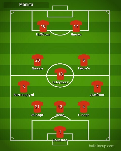 Мальта: Бонелло, Камендзулі, Ж.Борг, Пепе, С.Борг, Д.Мбонг (Аттард, 79), Н.Мускат (Крістенсен, 68), Янкам (Пізані (88), Гійом'є, П.Мбонг (Монтебелло, 87), Нвоко (Сатаріано, 68)