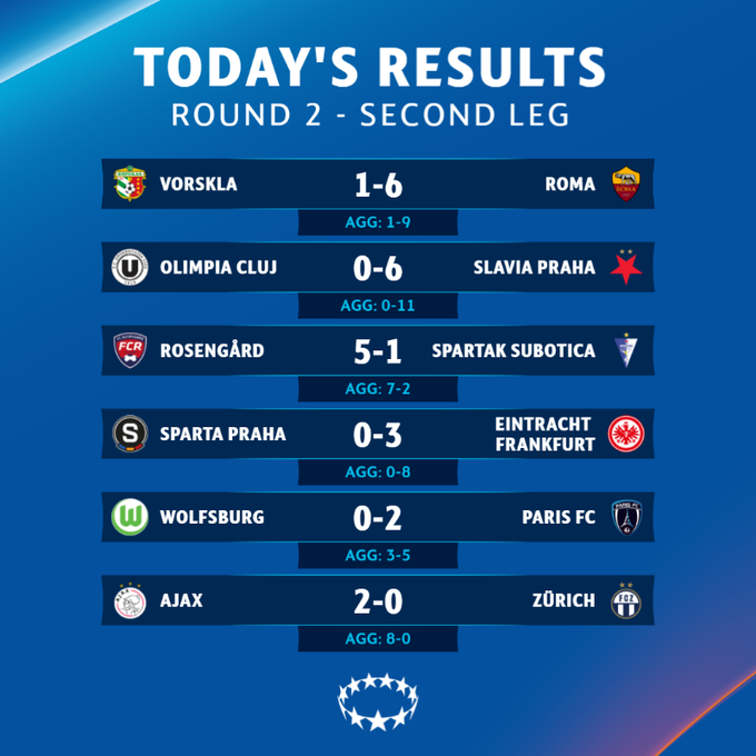 12 переможців пар вийшли до групового раунду жіночої ЛЧ, де приєдналися до Барселони, Ліону, Баварії та Челсі. Жеребкування групового раунду відбудеться 20 жовтня.