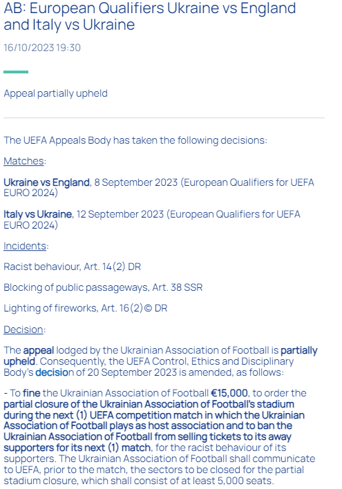 - «Оштрафувати Українську асоціацію футболу на 15 тисяч євро, розпорядитися про часткове закриття стадіону УАФ під час наступного матчу змагань УЄФА, в якому Українська асоціація футболу виступатиме як асоціація, що приймає».