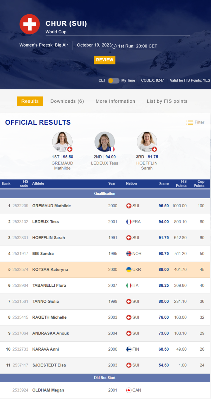 23-річна фристайлістка Катерина Коцар залишається єдиною українкою в історії, що відбиралася до фіналу Кубка світу з біг-ейру. На етапі у Курі у 2022-му вона показала сьомий результат у кваліфікації, а у фіналі стала шостою.