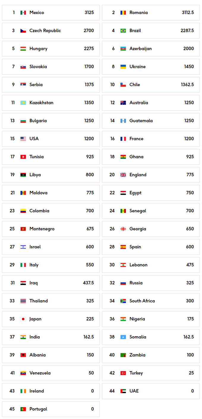 До топ-3 також входять Румунія (3112.5) та Чехія (2700). Далі у топ-10 йдуть: Бразилія (2287.5), Угорщина (2275), Азербайджан (2000),