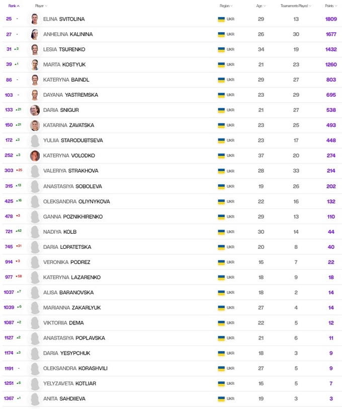 Еліна Світоліна, Ангеліна Калініна, Катерина Байндл і Даяна Ястремська зберегли свої позиції. Леся Цуренко підібралася впритул до топ-30, Марта Костюк також додала один рядок. Дар'я Снігур і Катаріна Завацька піднялися на 21 місце, Юлія Стародубцева, Анастасія Соболєва, Олександра Олійникова і Надія Колб оновили особисте досягнення.