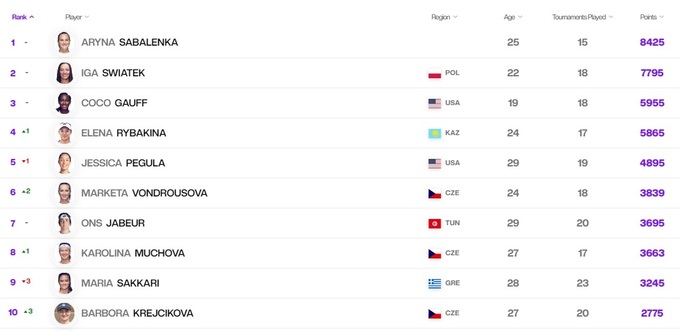 У першій десятці не обійшлося без змін, адже цього тижня зняли очки за Підсумковий турнір і за минулорічний турнір у Гвадалахарі. Так, Джессіка Пегула поступилася четвертою сходинкою Олені Рибакіній, на шосте місце піднялася Маркета Вондроушова. Барбора Крейчикова повернулася в десятку, а Марія Саккарі опустилася на 9 сходинку, пропустивши вперед ще й Кароліну Мухову.