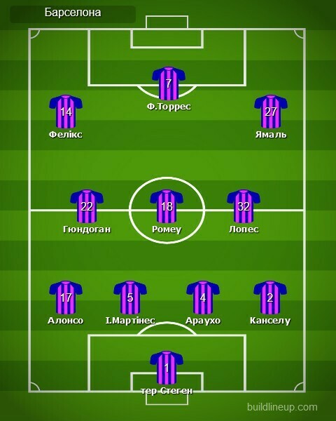 «Барселона»: тер Стеген, Алонсо (Бальде, 70), І.Мартінес (Крістенсен, 82), Араухо, Канселу, Гюндоган, Ромеу, Лопес (Касадо, 82), Фелікс (Гію, 75), Ф.Торрес, Ямаль.