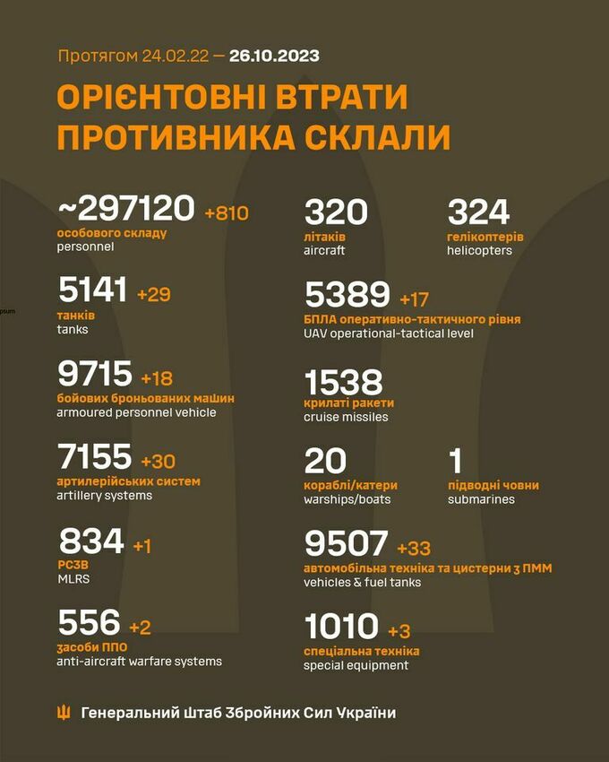 Українська армія знищила 29 танків, 18 БМП, 30 артилерійських систем та 810 окупантів. Загальна кількість знищених ворожих солдатів орієнтовно досягла 297,1 тисячі осіб.