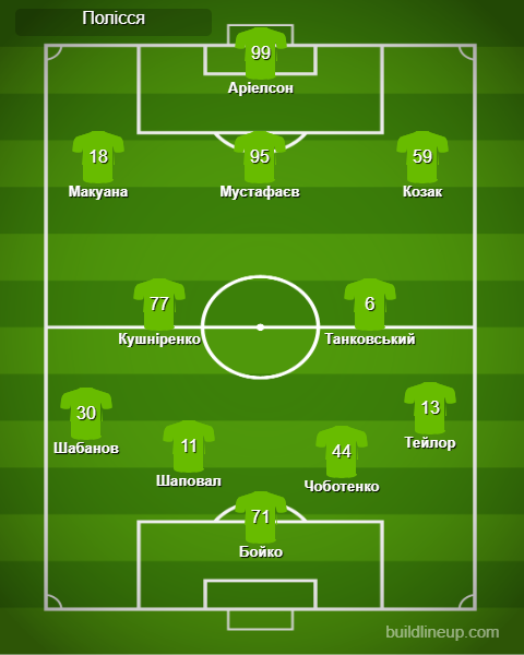 «Полісся»: Бойко - Тейлор (М. Кравченко, 46), Шаповал (Морозко, 46), Чоботенко, Шабанов - Кушніренко, Танковський - Козак, Мустафаєв (Крушинський, 46), Макуана - Аріелсон (Шастал, 77).