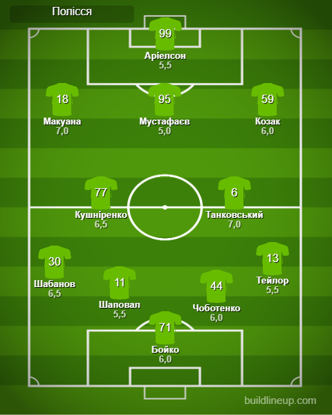 «Полісся»: Бойко - Тейлор (М. Кравченко, 46), Шаповал (Морозко, 46), Чоботенко, Шабанов - Кушніренко, Танковський - Козак, Мустафаєв (Крушинський, 46), Макуана - Аріелсон (Шастал, 77).