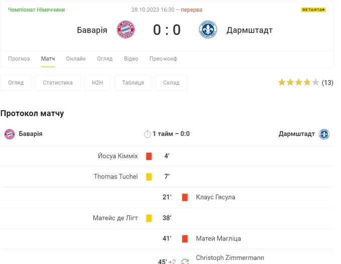 Завершився перший тайм матчу 9 туру чемпіонату Німеччини «Баварія» – «Дармштадт».