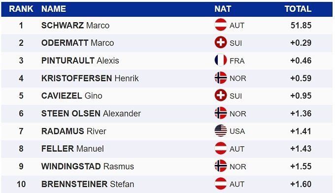 Однак по ходу змагань вітер посилився, і проведення гонки стало неможливим. На момент зупинки всі фаворити вже пройшли першу спробу, топ-10 мала такий вигляд: