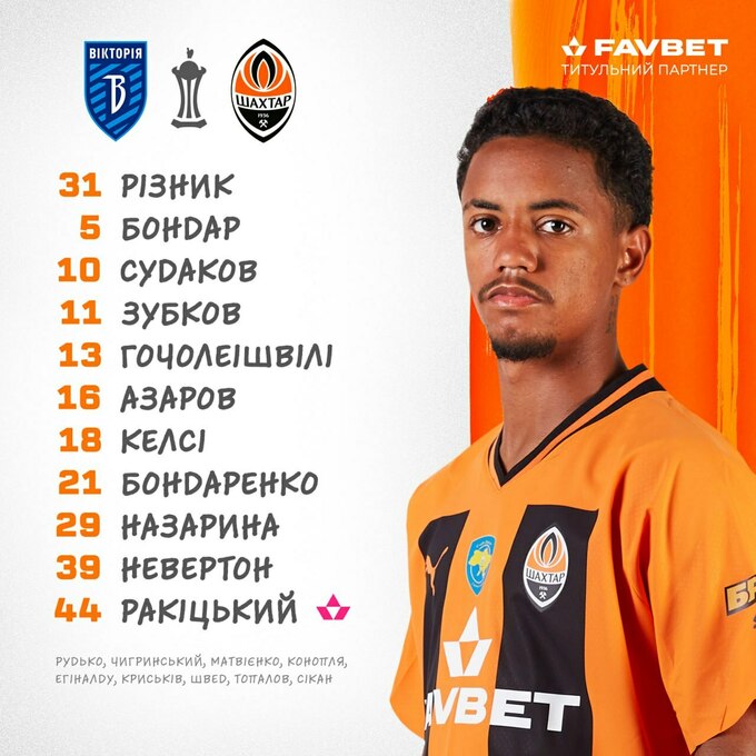 «Шахтар»: Різник – Азарові, Ракіцький, Бондар, Гочолеішвілі (Конопля, 67) – Назарина – Невертон (Криськів, 80), Судаков, Бондаренко, Зубков (Егіналду, 68) – Келсі (Сікан, 62).