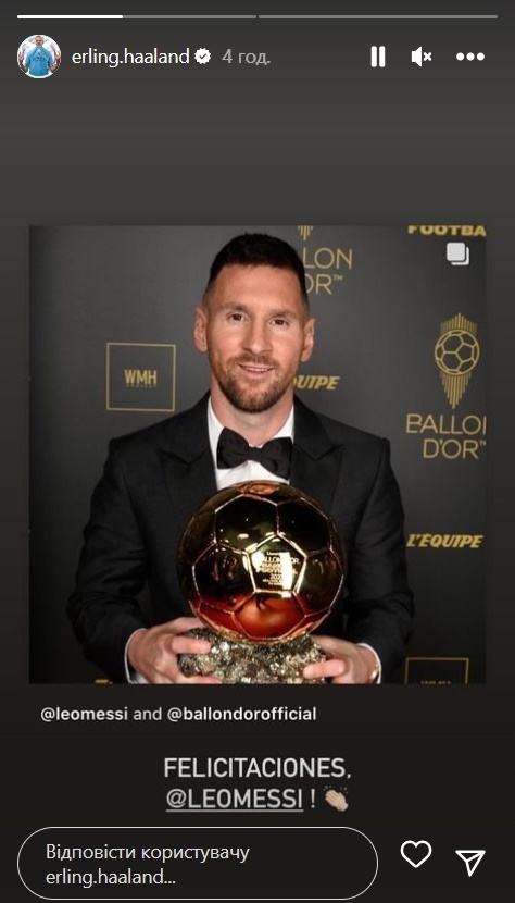 Нападник англійського клубу «Манчестер Сіті» і збірної Норвегії Ерлінг Холанд не залишився осторонь того факту, що аргентинський форвард Ліонель Мессі став володарем Золотого м'яча у 8-й раз в історії.
