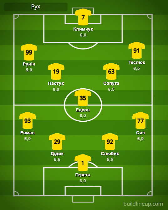 «Рух»: Герета – Роман, Дідик, Слюбик, Сич – Пастух, Едсон, Сапуга – Руніч (Квасниця, 53), Климчук (Соломон-Отабор,76), Теслюк (Карабін, 76).