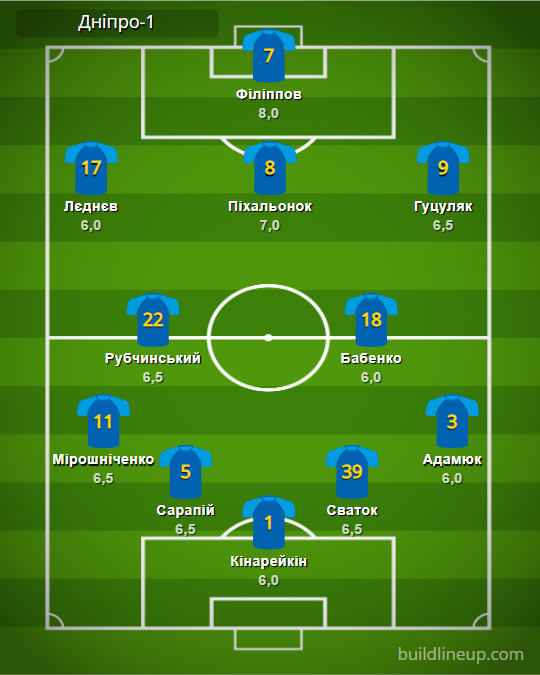 «Дніпро-1»: Кінарейкін – Мірошніченко, Сарапій, Сваток, Адамюк – Рубчинський (Горбунов, 82), Бабенко – Лєднєв (Вітіньйо, 64), Піхальонок (Кравець, 88), Гуцуляк – Філіппов.