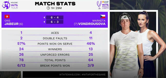 Turning the tables 🔄@ons_jabeur avenges this year's Wimbledon final by defeating Vondrousova 6-4, 6-3 in Cancun.#WTAFinals pic.twitter.com/UiYe8I3QnB