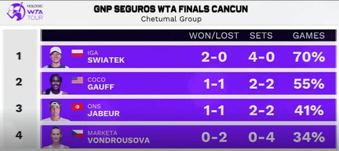 В останньому турі Жабер зіграє проти Свьонтек, а Вондроушова зустрінеться з Гофф. Маркета, незважаючи на 2 поразки, все ще має шанси вийти в плей-оф. Для цього потрібно, щоб Іга у двох сетах виграла у Жабер, а сама чешка у двох партіях закрила Гофф. За таких розкладів буде рахуватися відсоток виграних геймів у трьох тенісисток: Коко Гофф, Онс Жабер та Маркети Вондроушової.