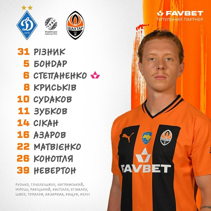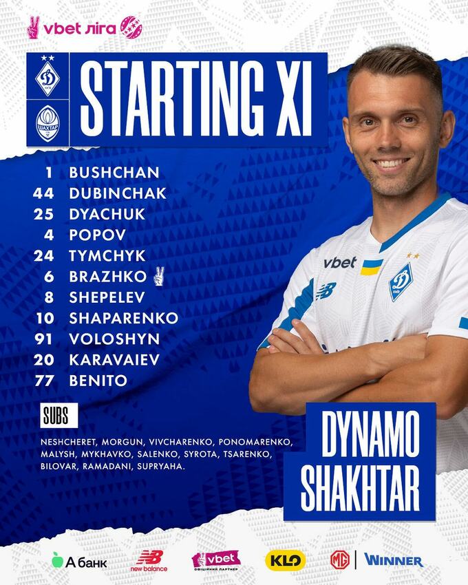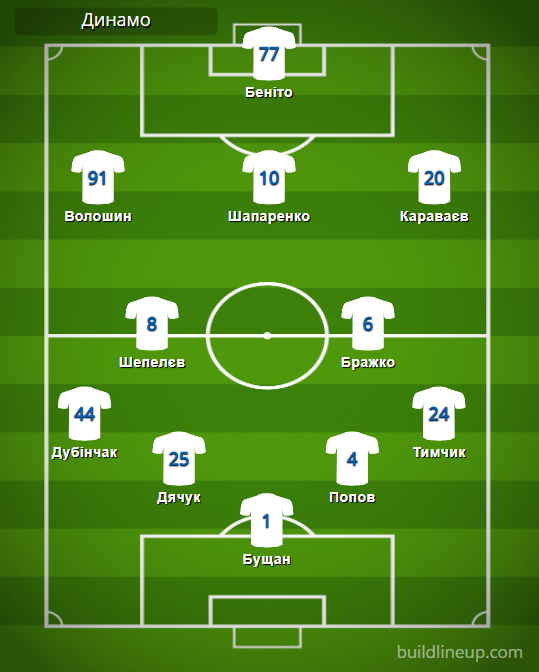 «Динамо» Київ: Бущан – Дубінчак, Дячук, Попов, Тимчик – Шепелєв, Бражко – Волошин (Пономаренко, 88), Шапаренко (Царенко, 83), Караваєв – Беніто (Супряга, 83).
