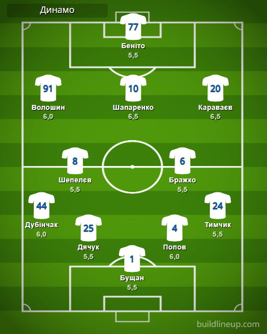 «Динамо» Київ: Бущан – Дубінчак, Дячук, Попов, Тимчик – Шепелєв, Бражко – Волошин (Пономаренко, 88), Шапаренко (Царенко, 83), Караваєв – Беніто (Супряга, 83).